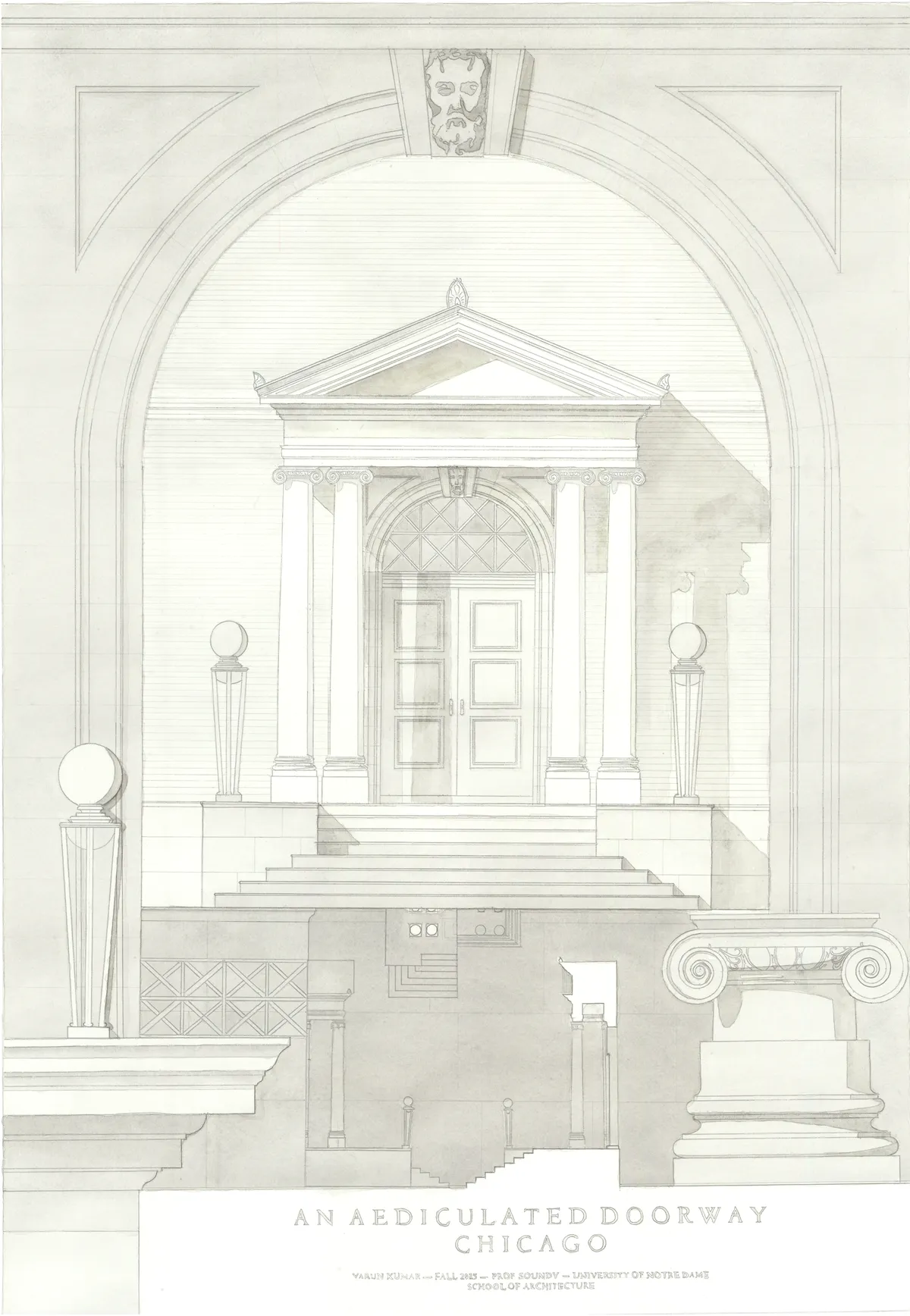 This project focused on a grand entrance to an exhibition hall for the Notre Dame School of Architecture in the Gold Coast of Chicago. A close study of Georgian precedents, both local and English, helped guide the design towards respect for its context and the traditions of the neighborhood.